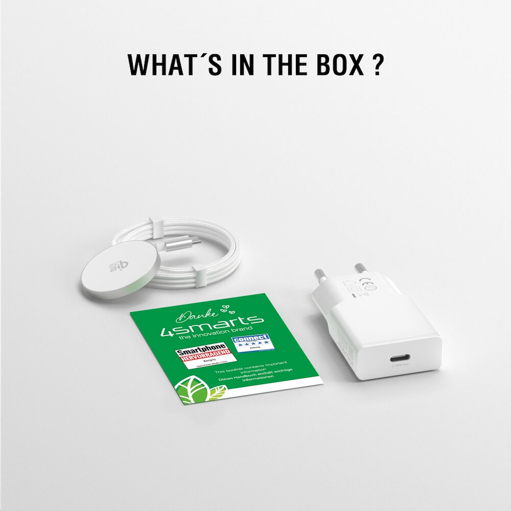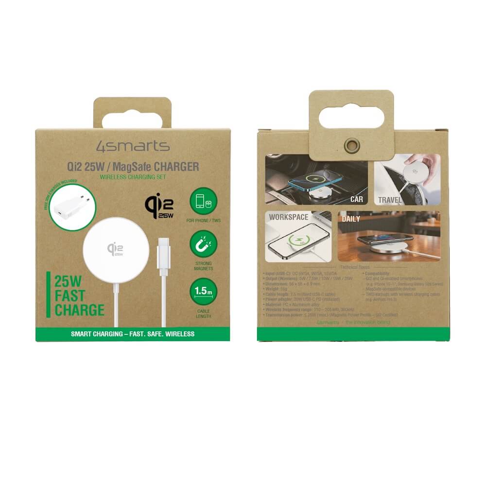 - В комплекта: 1 х 4smarts Qi2 USB-C Magnetic Wireless Qi Charger 25W, 1 х 30W захранване за ел. мрежа с USB-C порт
