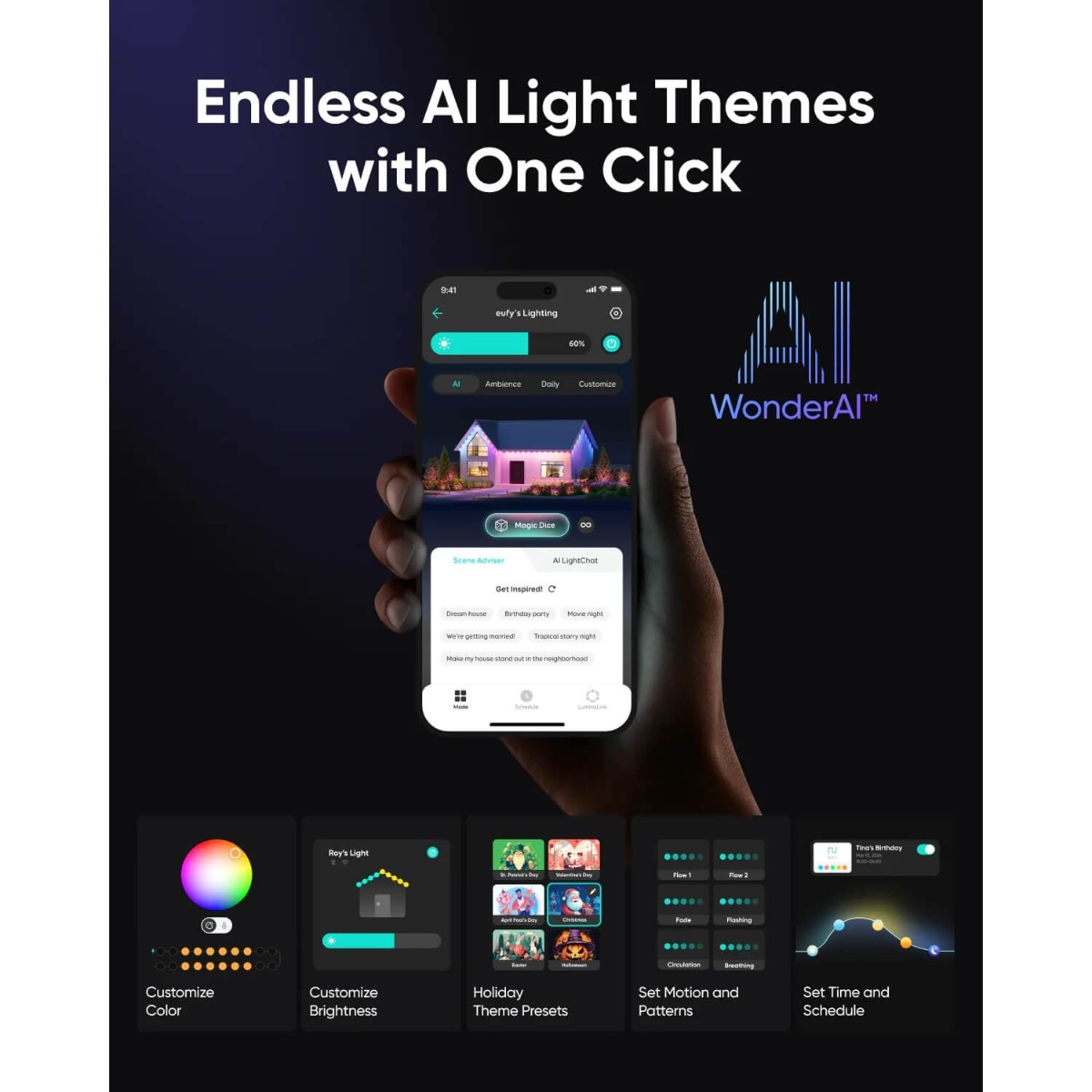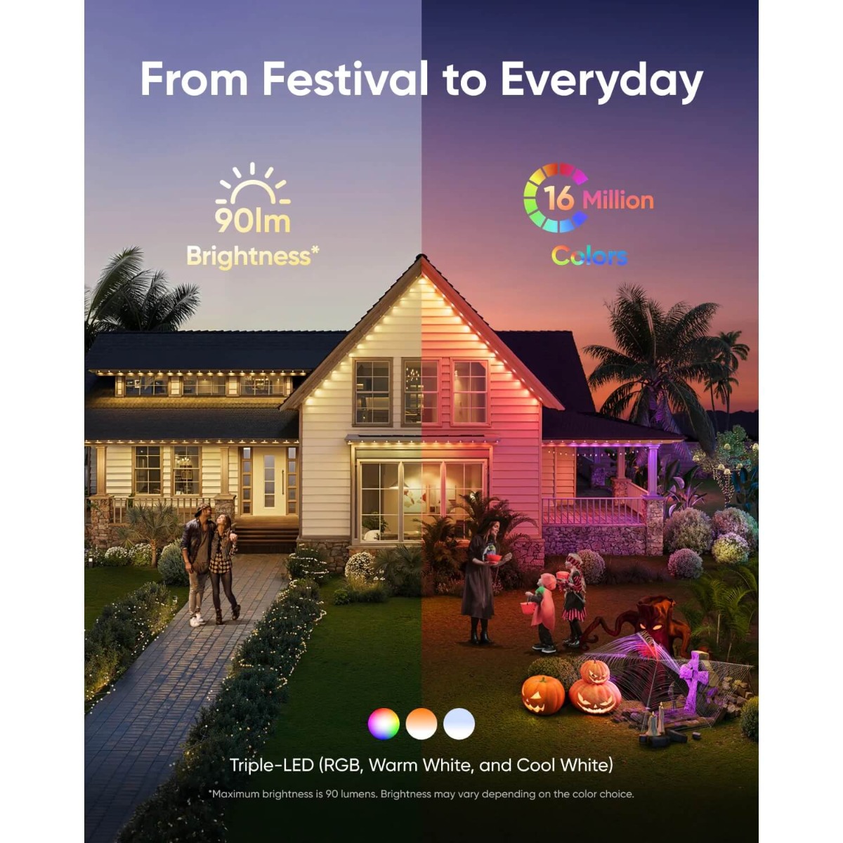 Представяме ви eufy Permanent Outdoor Lights E22 – интелигентна система за постоянно външно осветление, която предлага ярка, издръжлива и напълно персонализирана украса за вашия дом през цялата година. С тази система можете да се откажете от сезонното окачване на светлини.