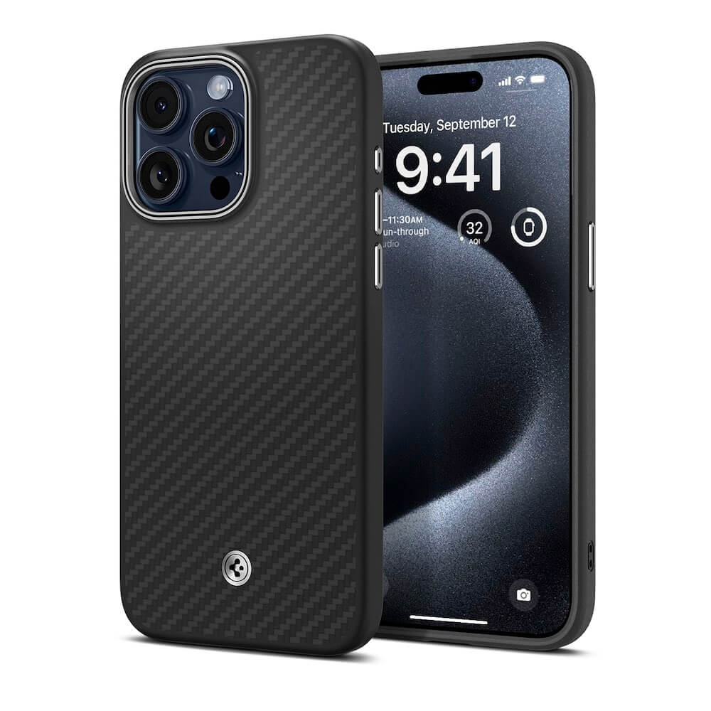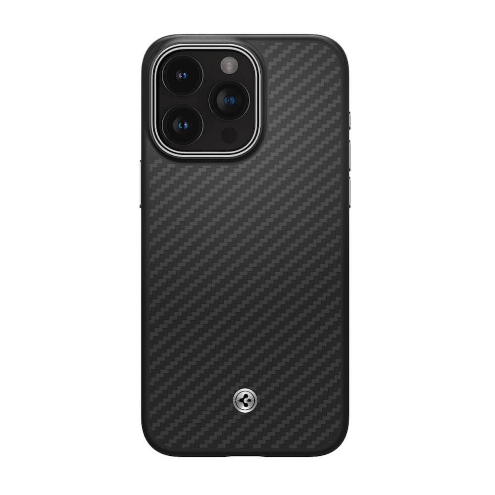 - • Spigen Enzo Aramid MagSafe Case е повдигнат около отвора за камерата, за да я от надраскване, а също така покрива и бутоните за вашия смартфон