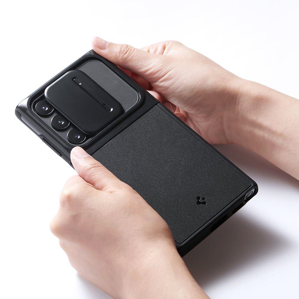 Spigen Optik Armor Case - тънък качествен силиконов (TPU) калъф с капак за камерата за Samsung Galaxy S22 Ultra (черен)