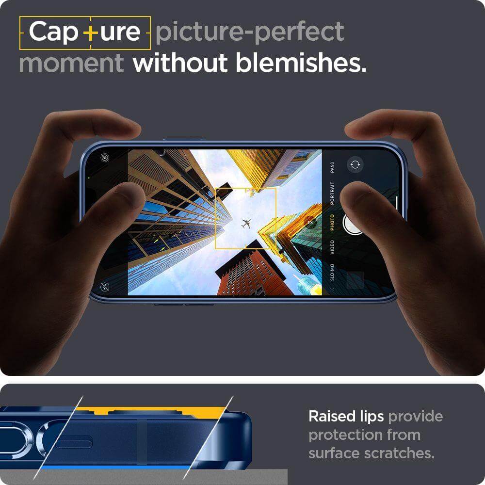 - Предпазен прсътен около камерата, който я покрива и предпазва