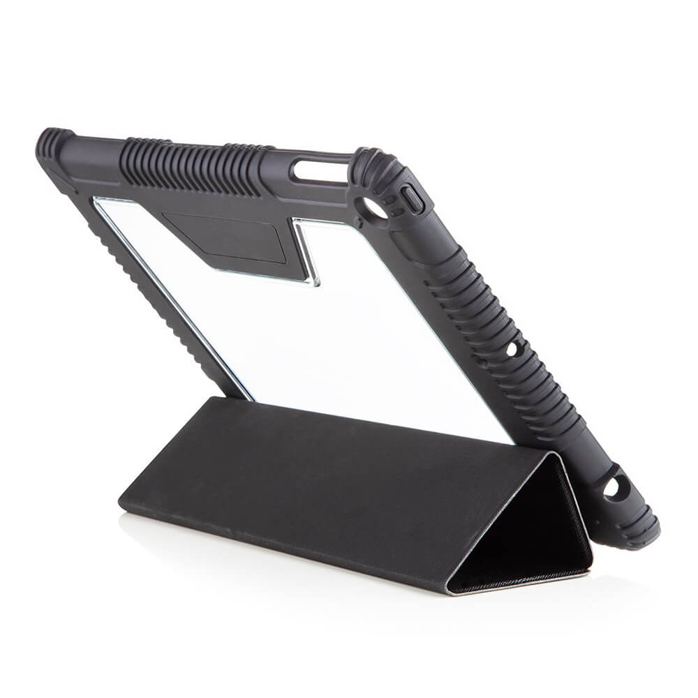 Tactical Riot Shield Case - удароустойчив калъф от изкуствена кожа и поставка за iPad 8 (2020), iPad 7 (2019) (черен)