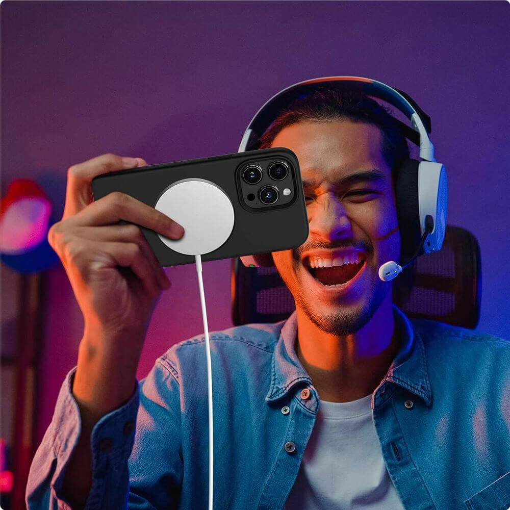 - • Калъфът е снабден с магнит, благодарение на който е съвместим с MagSafe аксесоари. Това е изцяло нов стандарт на Apple за бързо и лесно свързване на аксесоари и безжични зарядни устройства