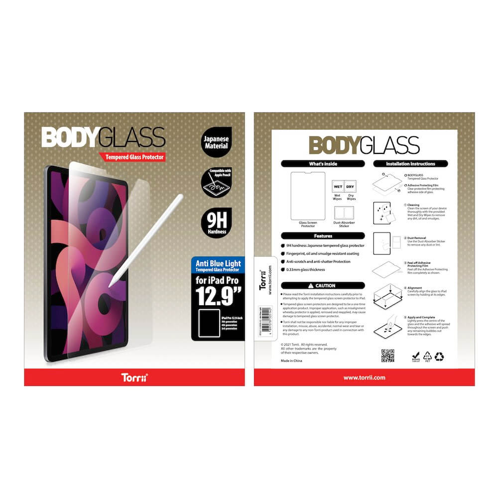 Torrii BodyGlass Anti Blue Light Clear Tempered Glass Screen Protector - калено стъклено защитно покритие за дисплея на iPad Pro 12.9 M1 (2021), iPad Pro 12.9 (2020), iPad Pro 12.9 (2018) (прозрачен)