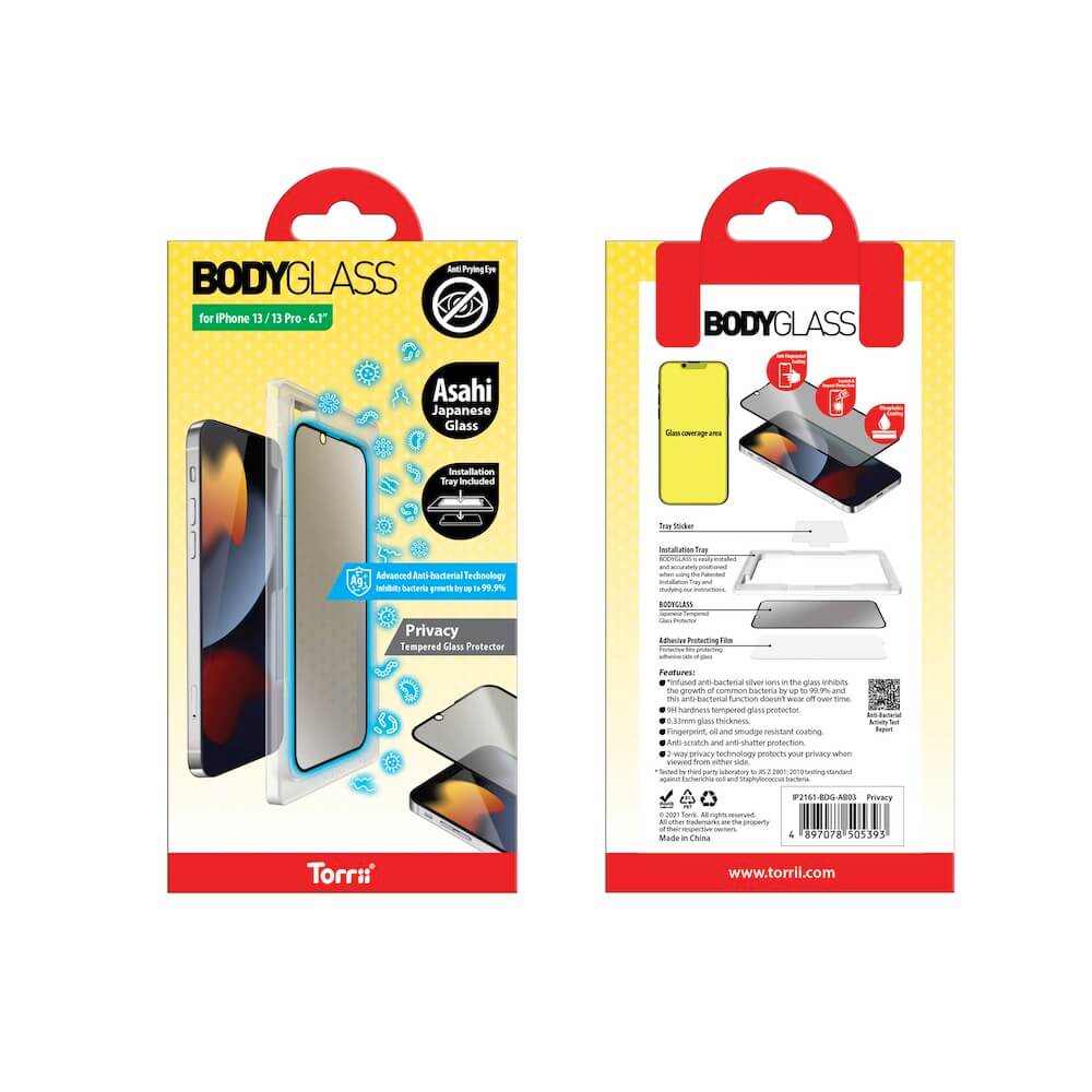 Torrii BodyGlass Privacy 3D Full Cover Anti-Bacterial Glass - калено стъклено защитно покритие с антибактериално покритие и определен ъгъл на виждане за целия дисплей на iPhone 13, iPhone 13 Pro (прозрачен-черен)