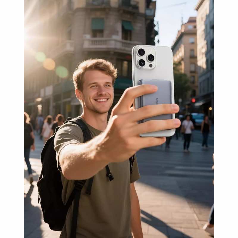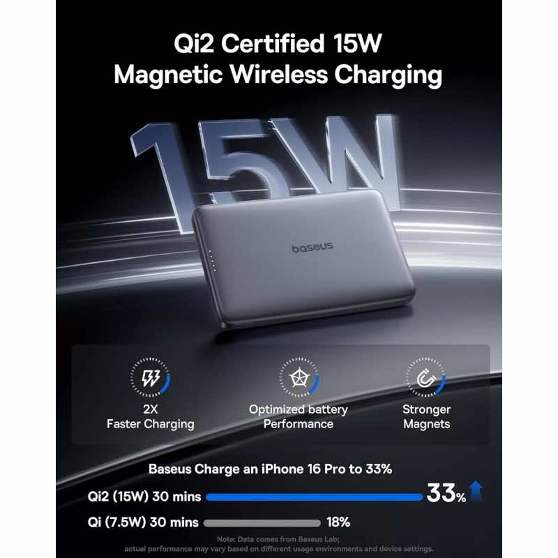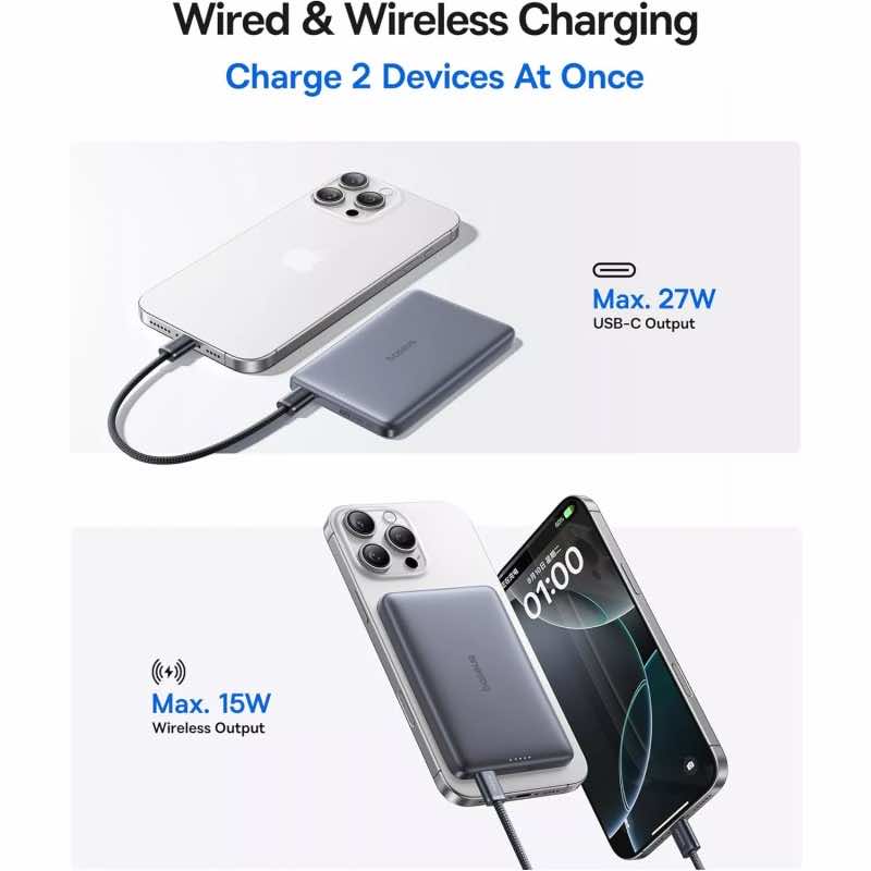 С Baseus PicoGo AM41 можете да зареждате вашия iPhone или друго Qi-съвместимо устройство безжично, благодарение на мощността от 15W. Устройството е проектирано с вградени мощни магнити, които осигуряват сигурно захващане. Можете да зареждате два устройства едновременно, което го прави изключително удобно за ежедневна употреба.