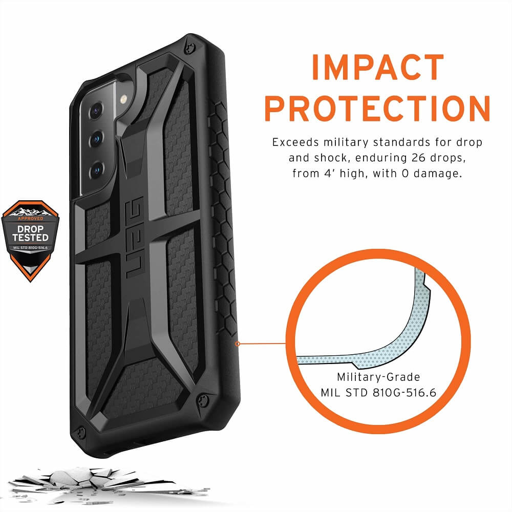 - Серията Monarch на Urban Armor за Galaxy S21 Plus съчетава в себе си уникален дизайн и прецизна изработка, за да покрие дори двойно, военните изисквания за защита при изпускане или случайно падане