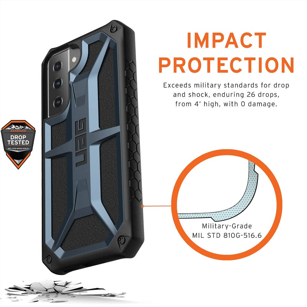 - Серията Monarch на Urban Armor за Galaxy S21 Plus, съчетава в себе си уникален дизайн и прецизна изработка, за да покрие дори двойно, военните изисквания за защита при изпускане или случайно падане