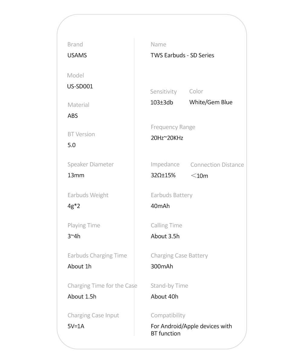 - 1 x USAMS SD001 TWS Earbuds - 1 x зареждащ кейс - 1 x MicroUSB кабел - 2 х силиконов тапи за ухо - 1 х ръководство