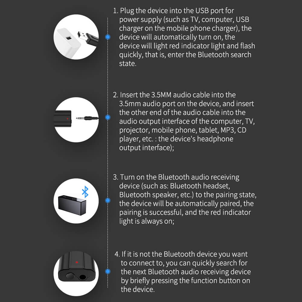 - Режим на предаване: безжично поточно предаване чрез Bluetooth връзка на аудио сигнал от телефон, таблет или компютър към слушалки, високоговорители, аудио системи, системи за домашно кино и др.