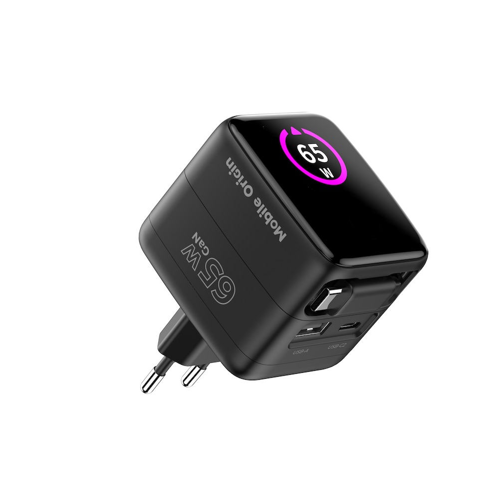 Захранване за ел. мрежа с USB-A и USB-C изходи и вграден USB-C кабел - Mobile Origin PW3 GaN TFT Display Wall Charger 65W (черен)