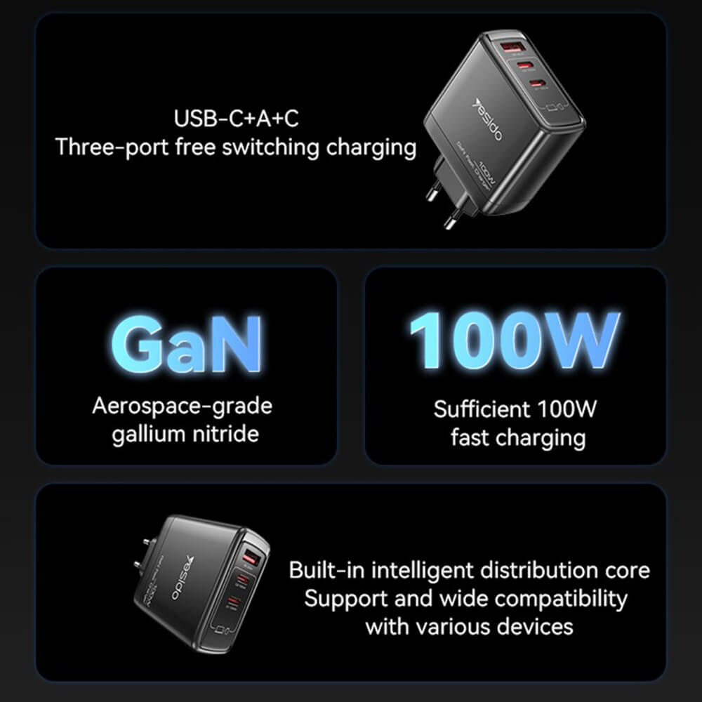 Захранване за ел. мрежа за лаптопи, смартфони и таблети с 2xUSB-C и 1xUSB-A изходи - Yesido YC142 GaN Fast Wall Charger 100W (черен)