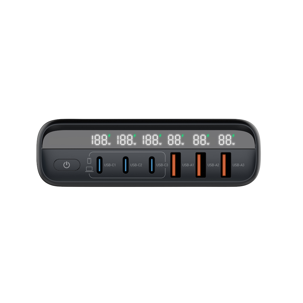 С 6 порта, включително 3 USB-C и 3 USB-A, можете да зареждате до 6 устройства едновременно. Това е перфектно за лаптопи, таблети, телефони, игрови конзоли и много други устройства.