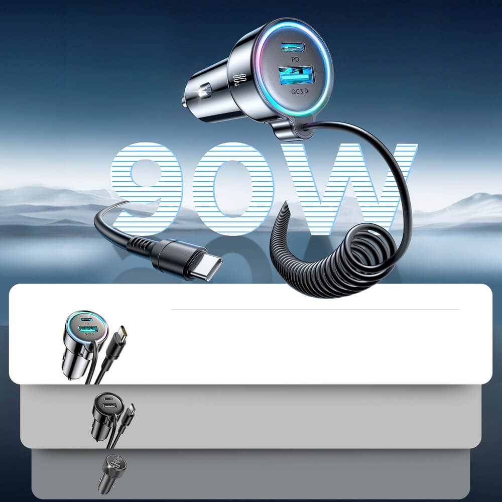 - Компактно и практично зарядно за кола с вграден USB-C кабел и USB-A и USB-C изходи